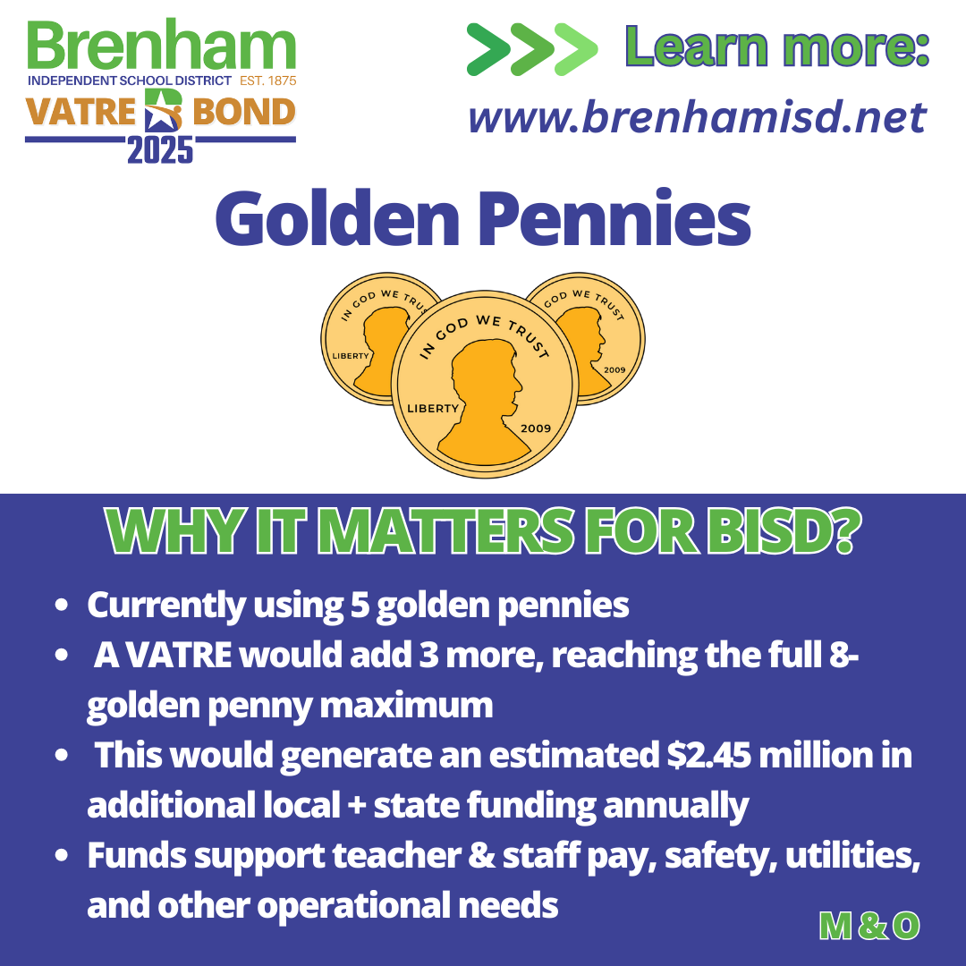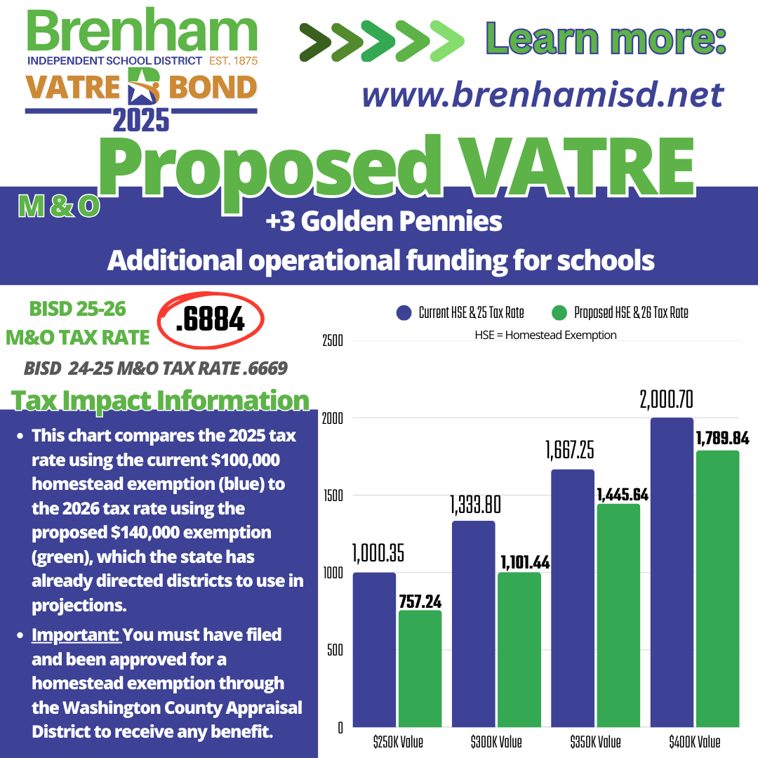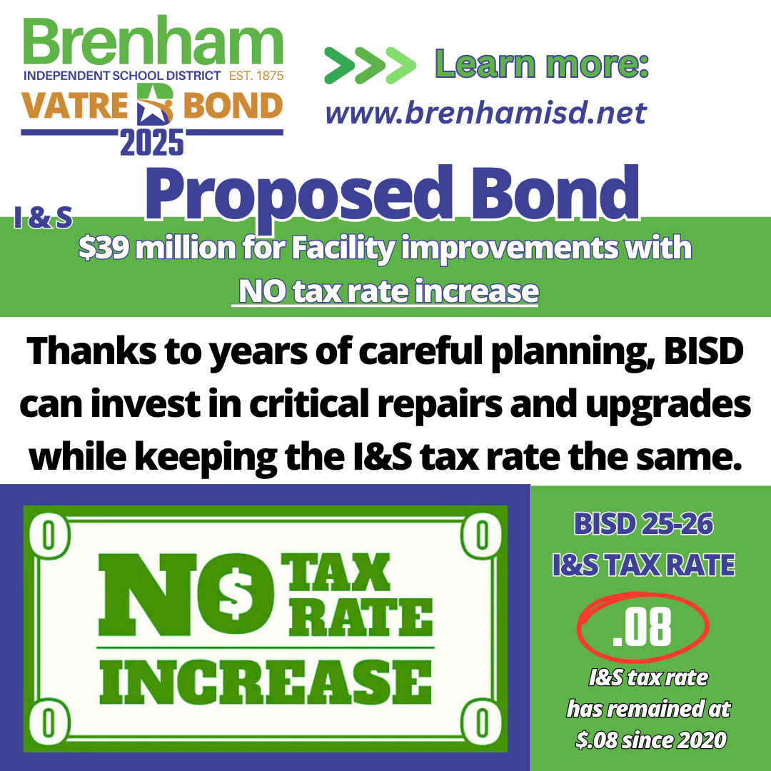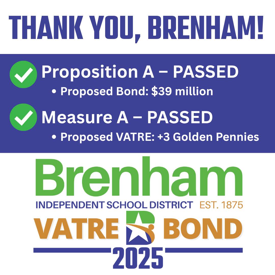 Brenham ISD extends its sincere thanks to the voters, Board of Trustees, and Strategic Planning Committee whose dedication, collaboration, and belief in public education made this moment possible. The passage of both Proposition A (Bond) and Measure A (VATRE) reflects a powerful investment in the future of our students, staff, and schools.