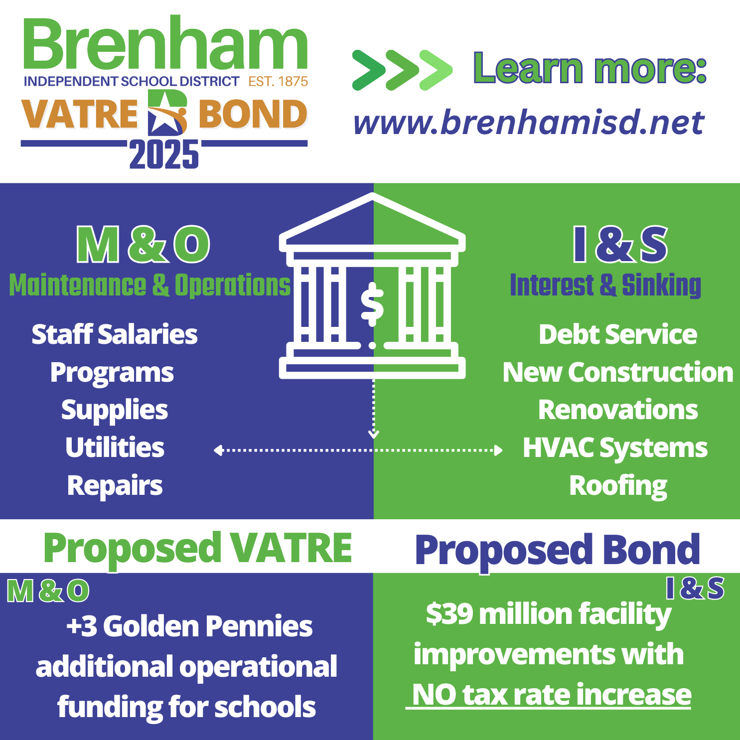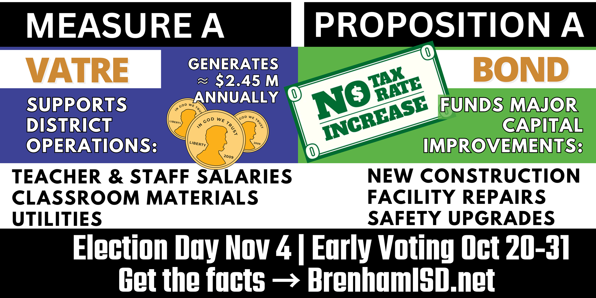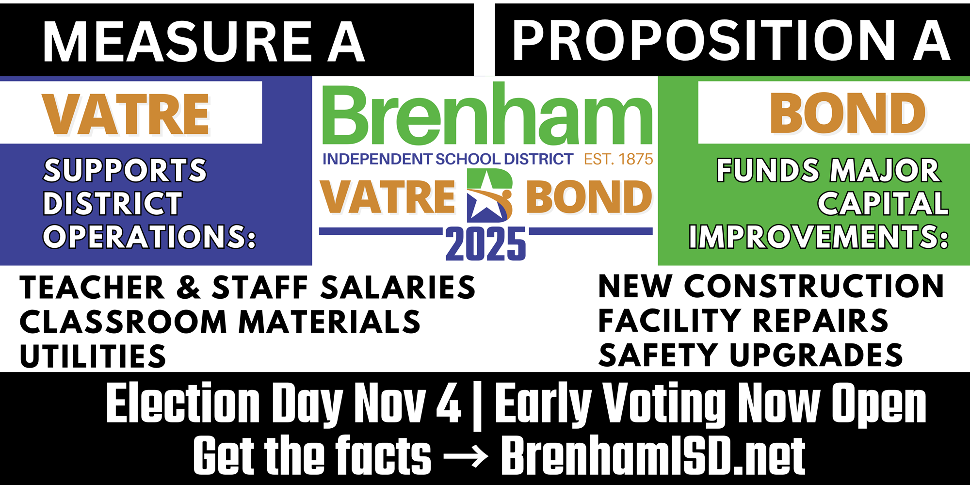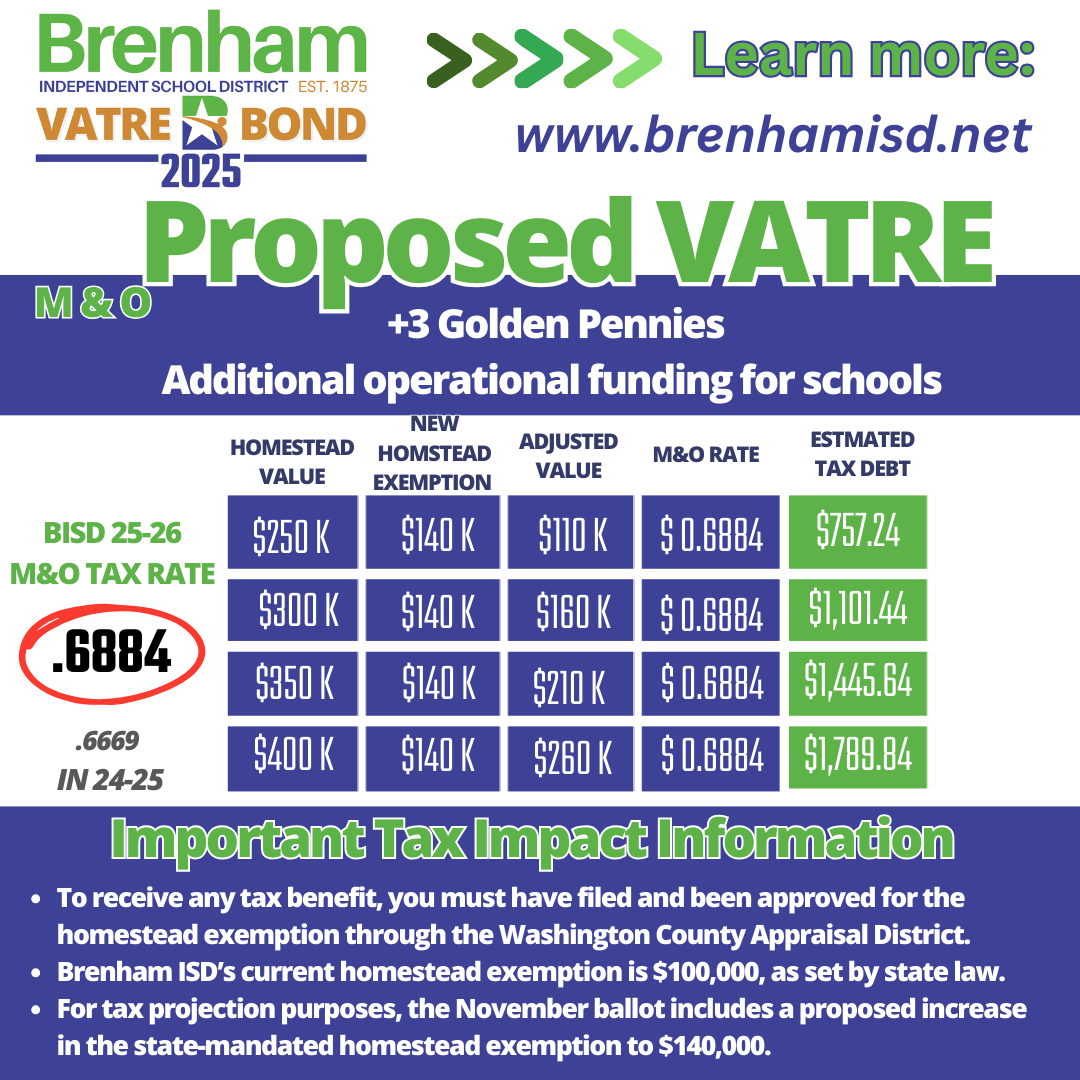 Brenham ISD extends its sincere thanks to the voters, Board of Trustees, and Strategic Planning Committee whose dedication, collaboration, and belief in public education made this moment possible. The passage of both Proposition A (Bond) and Measure A (VATRE) reflects a powerful investment in the future of our students, staff, and schools.