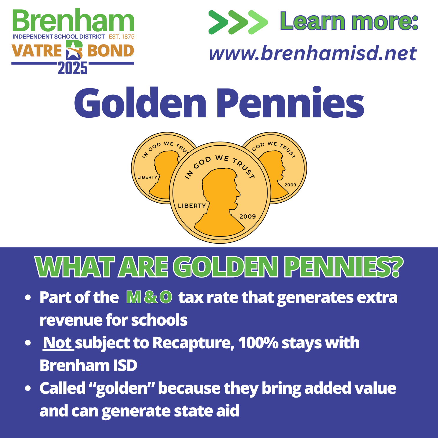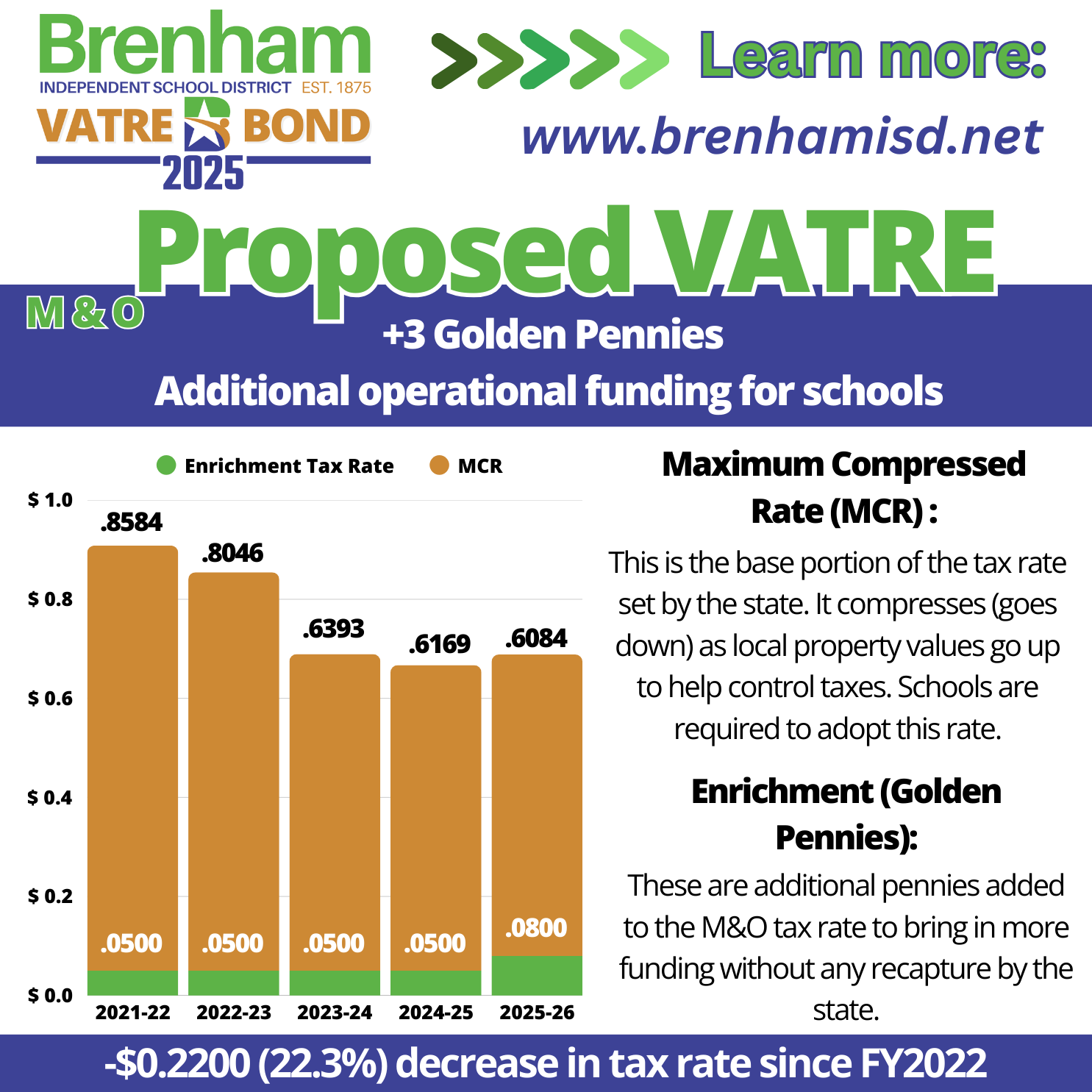 Measure A, the Voter-Approved Tax Rate Election (VATRE), will generate approximately $2.45 million annually in additional local funding. These funds are not subject to recapture and will remain entirely in Brenham ISD to support teacher compensation, staff stipends, classroom resources, and student programs.