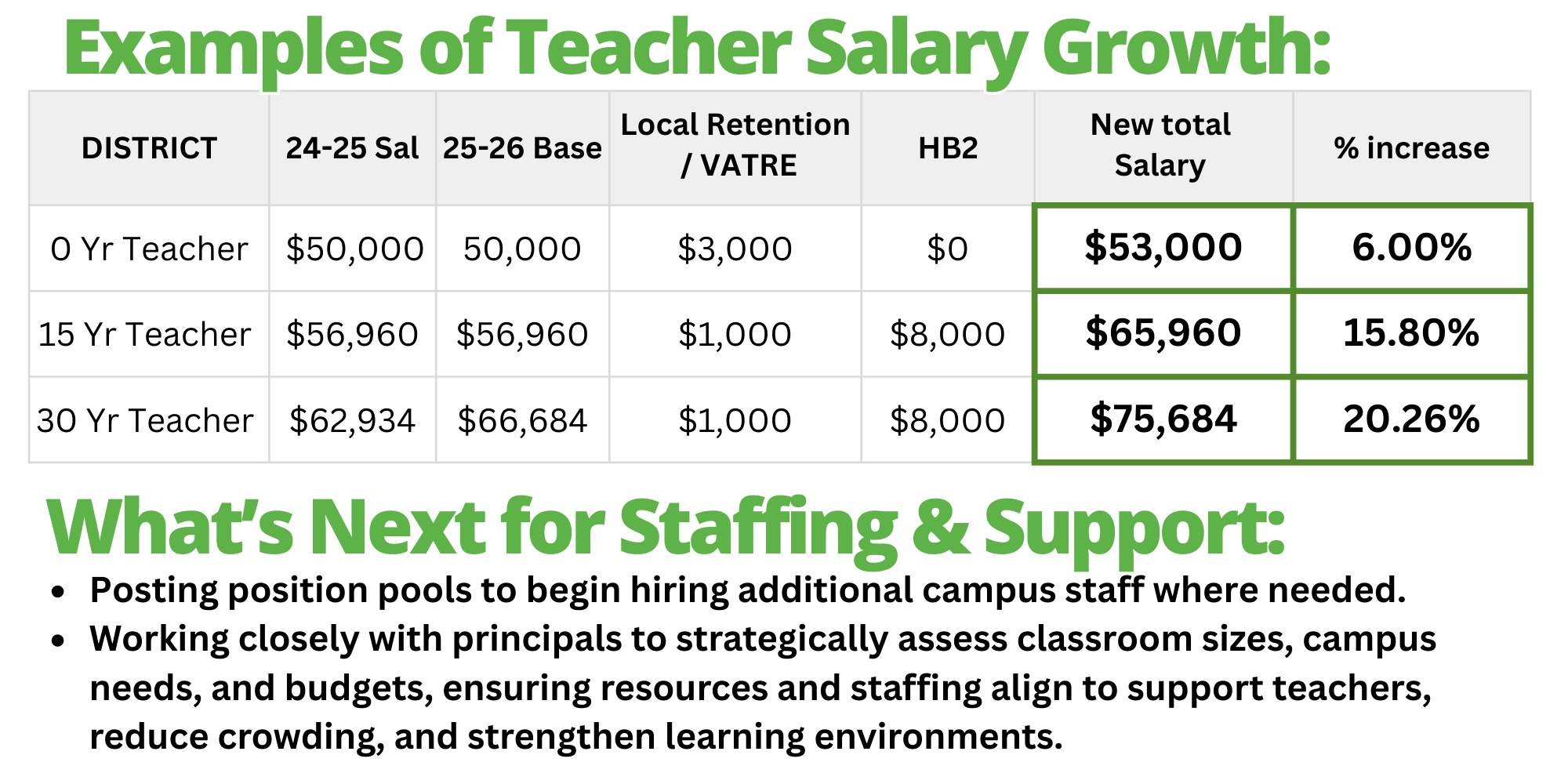 These steps reflect our commitment to recruiting and retaining high-quality educators, reducing class sizes, and strengthening the foundation of support that shapes student success.