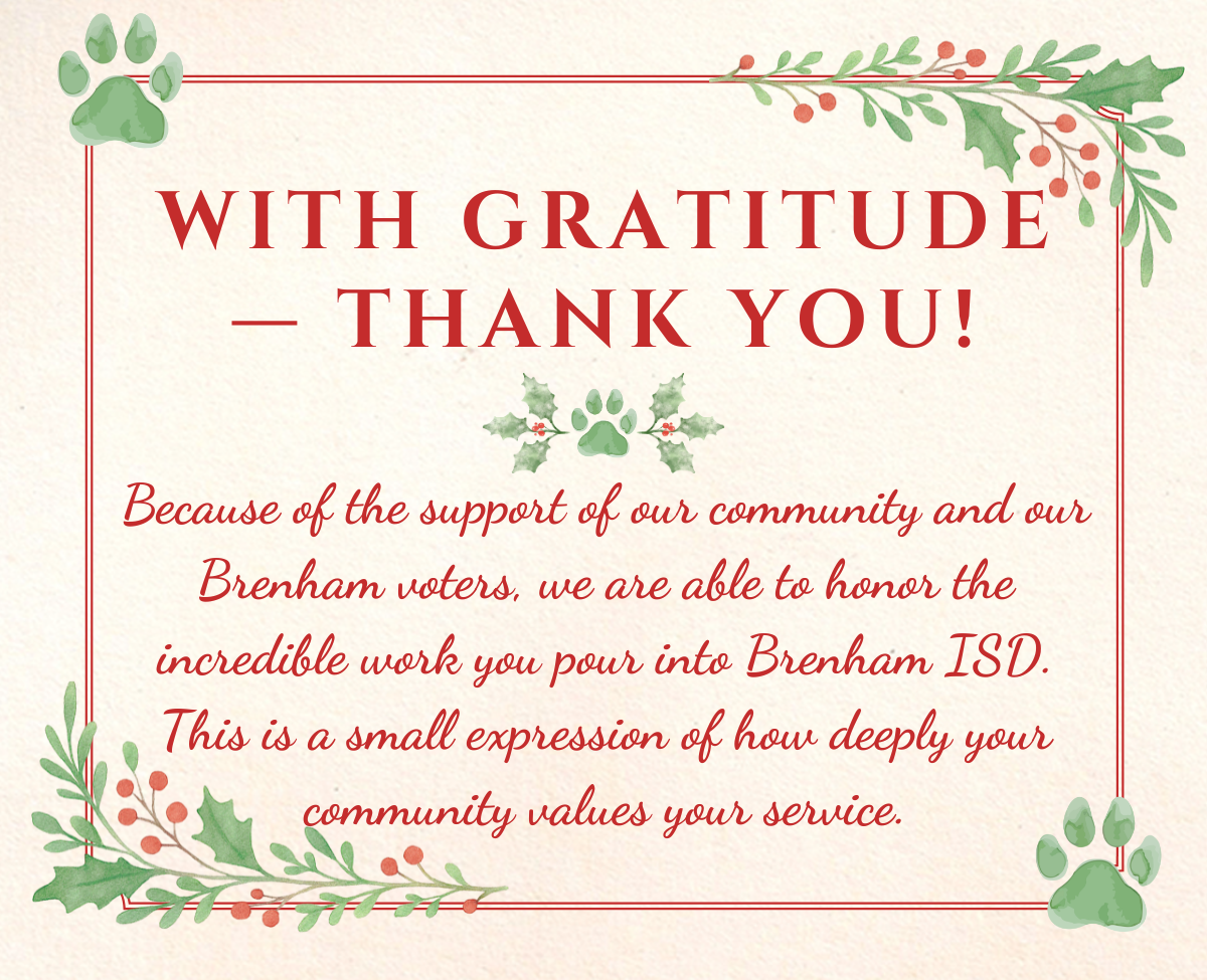 On Monday, 12/15/2025, Brenham ISD surprised all employees with a one-time $500 retention check. This moment was made possible through the support of Brenham voters who approved the 2025 VATRE, giving our district the ability to strengthen compensation and reinforce the stability of our workforce.